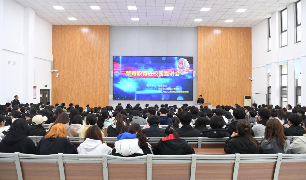 为提高识毒、防毒、拒毒能力,打造“无毒校园”,11月22日下午,我校联合枣庄市公安局在薛城校区增信楼113公共教室开展禁毒宣讲会。校党委委员、副校长丰雷,市禁毒委副主任、市公安局党委委员、副局长、交巡警支队支队长杜茂广,市禁毒办副主任、禁毒支队支队长纪尚峰,薛城分局党委副书记、政委周涛,薛城分局党委委员、副局长王洪刚出席。保卫处、学生工作处、薛城分局禁毒大队主要负责同志参加活动,各学院师生代表300余人聆听报告。宣讲会由保卫处处长王奉涛主持。