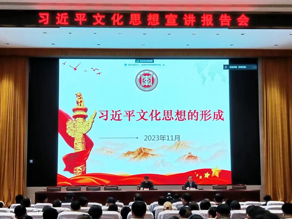 11月22日下午,我校举办习近平文化思想宣讲报告会,邀请《DB中国旗舰官方网站学报》主编、自然国学研究院院长史大丰教授作题为“习近平文化思想的形成”的报告。校党委委员、纪委书记、省监委驻DB中国旗舰官方网站监察专员路绪剑,党委委员、宣传部部长张昌林出席报告会。报告会由张昌林主持。
