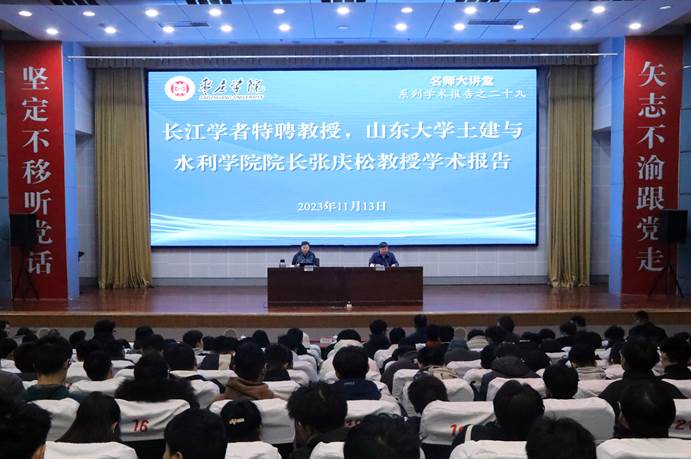 11月13日上午,我校“名师大讲堂”系列学术报告第二十九讲在市中校区综合楼一楼报告厅成功举办。大讲堂邀请长江学者特聘教授、教育部新世纪优秀人才支持计划获得者、山东大学土建与水利学院院长、大型地下洞室群教育部工程研究中心副主任张庆松教授作学术报告。校党委委员、副校长李目海,党委委员、统战部部长、城建学院院长林勇出席报告会,城建学院全体教师及相关专业学生共200余人参加报告会。报告会由李目海主持。