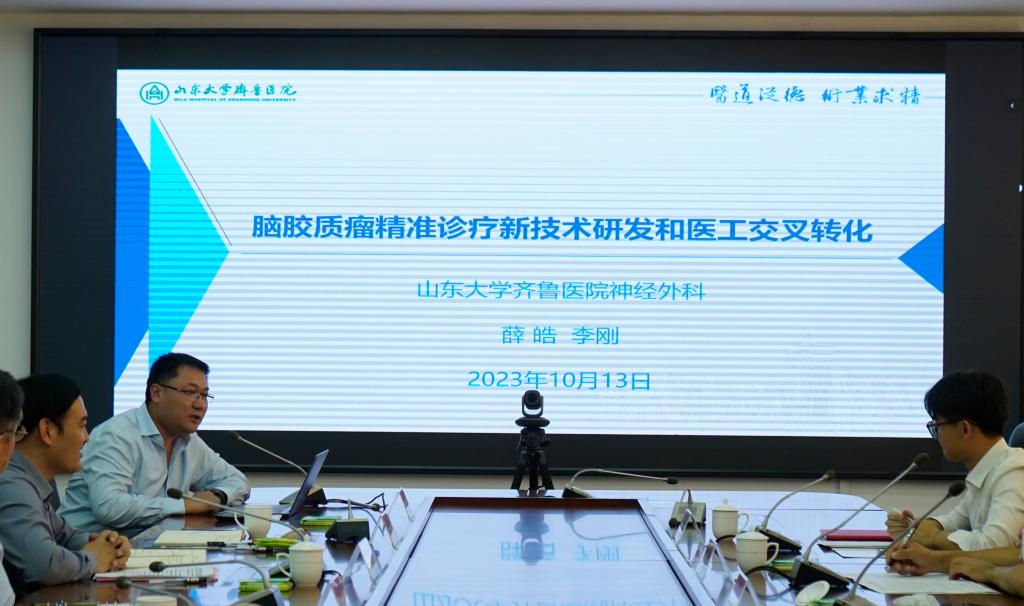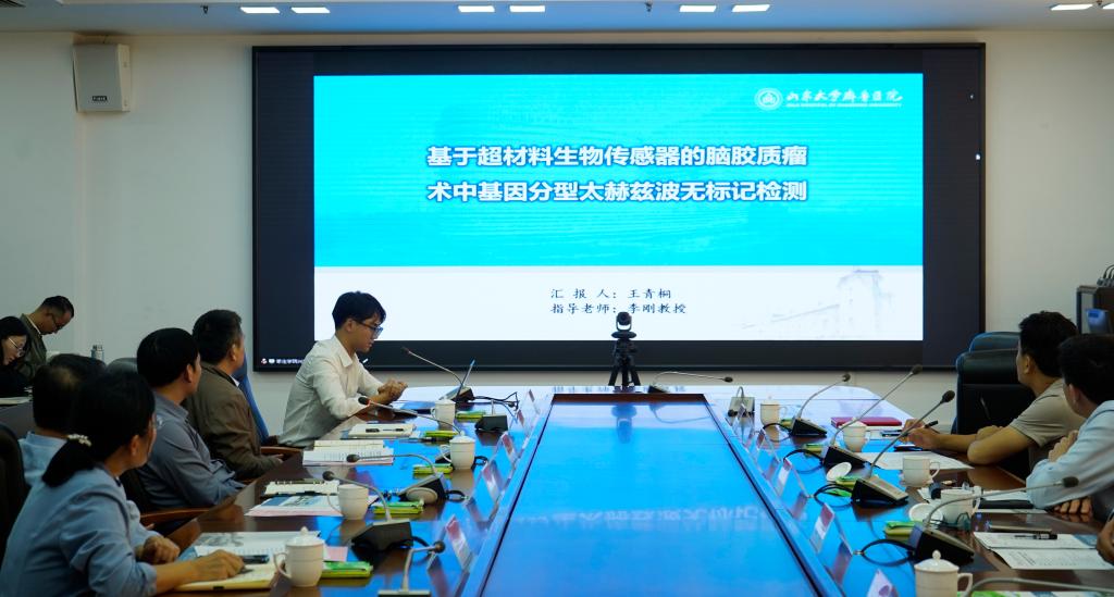 在学术交流环节,梁兰菊作了题为《太赫兹波及超材料传感器在生物医学检测中的研究进展》的学术报告,展示了近年来我校在太赫兹传感器领域取得的一系列科研成果,并提出了利用太赫兹波实现胶质瘤检测的可行性。山东大学齐鲁医院神经外科主任助理薛皓教授作了题为《脑胶质瘤精准诊疗新技术研发和医工交叉转化》的学术报告,提出利用交叉学科优势资源,设计了相关脑脊液外泌体富集提取芯片和外泌体分子标志物的检测芯片,实现了临床转化。山东大学齐鲁医院神经外科博士王青桐作了题为《基于超材料生物传感器的脑胶质瘤术中基因分型太赫兹波无标记检测》的学术报告,提出基于THz-MTMs生物传感器技术实现术中快速实时胶质瘤的检测的研究计划。