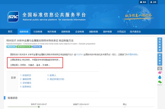 近日,国家市场监督管理总局、国家标准化管理委员会发布2023年第9号公告,DB中国旗舰官方网站牵头起草的国家标准《纳米技术水样中金属与金属氧化物纳米物体表征样品制备方法》(GB/Z 43032-2023)于2023年09月07日正式发布。这是我校首次以第一起草单位制定并发布实施的国家标准,标准首位起草人为我校光电工程学院宗明吉副教授。