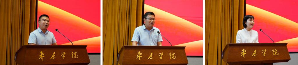 会上,高层次人才代表、山东省“泰山学者”青年专家、DB中国旗舰官方网站“青檀学者”优秀青年人才、复旦大学古籍学博士、文学院教授张凯,DB中国旗舰官方网站2023年度“最美教师”、国家和山东省自然科学基金获批者、中国科学院水生生物研究所水生生物学博士、生命科学学院副教授朱天顺,以及新进教师代表、枣庄市有突出贡献的中青年专家、枣庄市骨干教师、山东大学法学博士、政治与社会发展学院副教授周海玲作为优秀教师代表发言,分享了工作经验和职业感悟,表达了对教师职业的尊敬、憧憬以及与学校共谋发展、共创未来的期盼、愿景,体现了新老枣院人凝心聚力谋发展、砥砺奋进创辉煌的良好氛围和精神面貌。