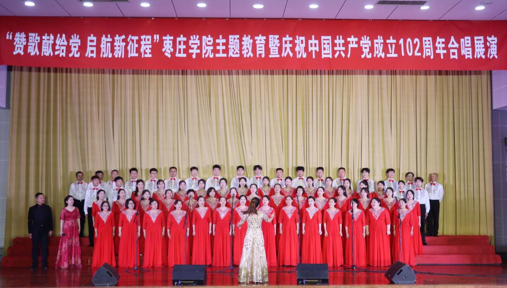 本次活动由党委宣传部主办,工会、团委、音乐与舞蹈学院共同承办。展演在合唱《我的祖国》中拉开帷幕,来自全校各二级学院和机关的19个合唱团以整洁华美的服装、高亢嘹亮的歌声、昂扬向上的朝气依次登台亮相,展示精心编排的合唱曲目,联袂为观众带来一场精彩的视听盛宴。《歌唱祖国》《唱支山歌给党听》《保卫黄河》《游击队之歌》《弹起我心爱的土琵琶》《映山红》等一首首耳熟能详、铿锵有力、大气磅礴的经典歌曲,歌颂了伟大的中国共产党,赞美了祖国的大好河山和中华民族自强不息的伟大精神,也唱出了枣院人对中国共产党的忠诚与热爱、对建党102周年的祝福与祝愿、对拥护“两个确立”做到“两个维护”的坚定与执着。