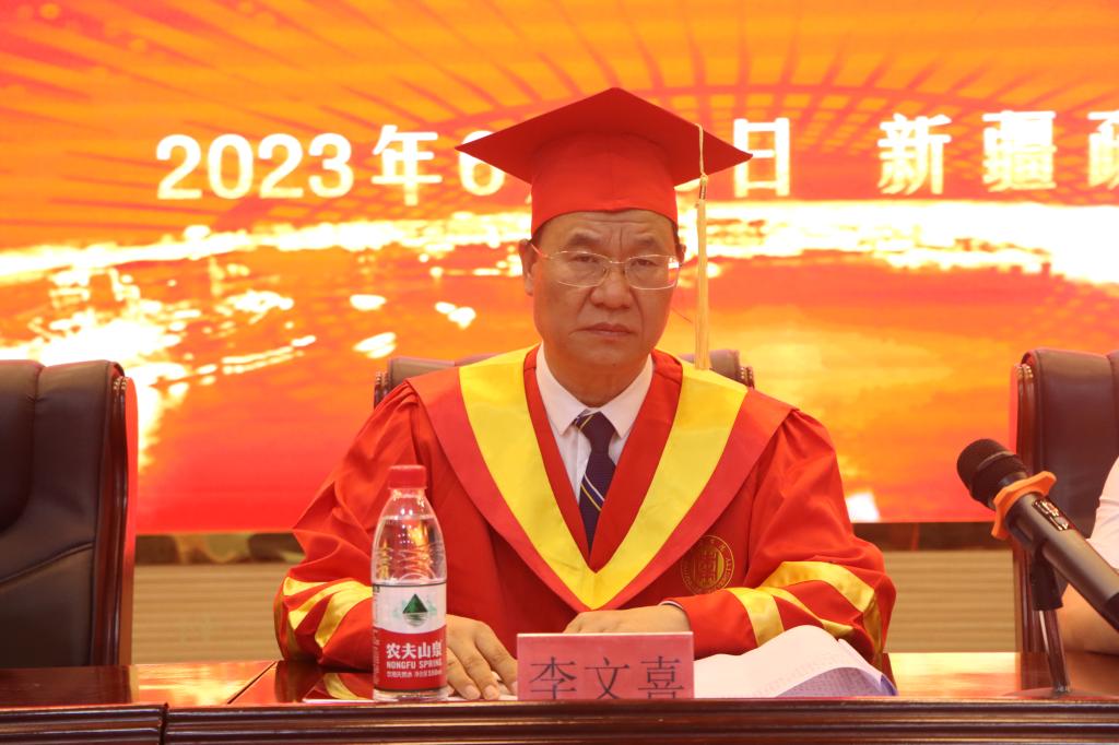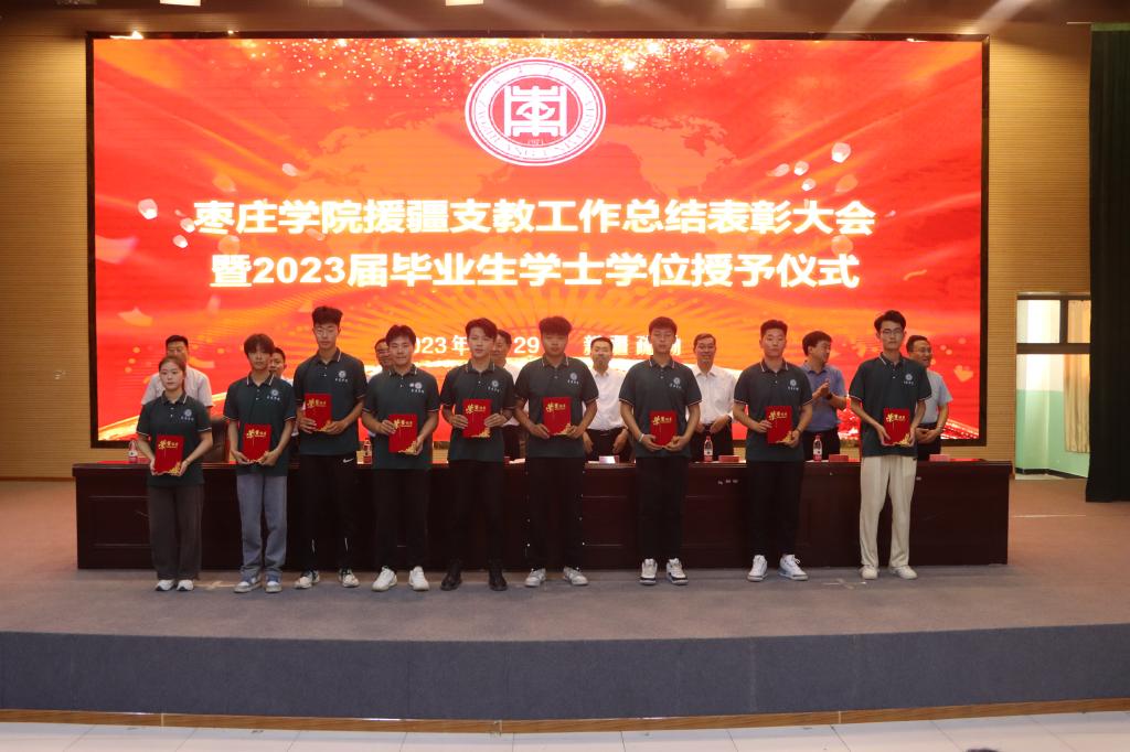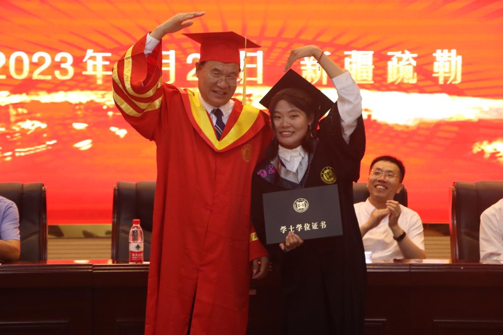 总结大会后,进行了援疆支教毕业生学位授予仪式。学生工作处处长王维忠主持仪式,教务处处长房永磊宣读授予支教团17名2023届本科毕业生学士学位的决定。李文喜为他们拨穗正冠、颁发学士学位证书并合影留念。