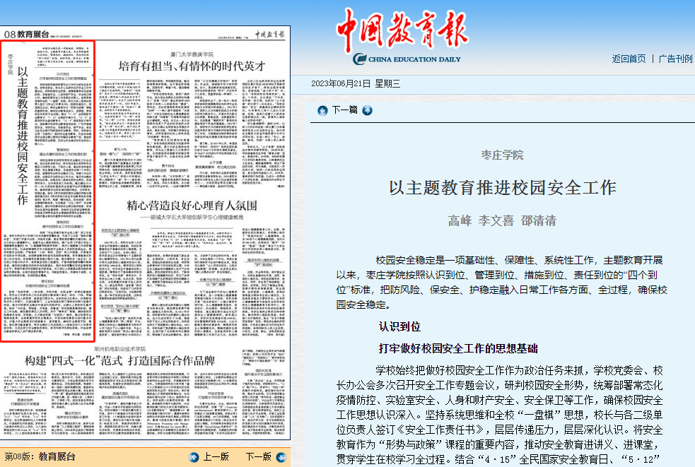 6月21日,中国教育报刊发高峰、李文喜署名文章《DB中国旗舰官方网站以主题教育推进校园安全工作》,报道了主题教育开展以来,DB中国旗舰官方网站按照认识到位、管理到位、措施到位、责任到位的“四个到位”标准,把防风险、保安全、护稳定融入日常工作各方面、全过程,确保校园安全稳定的经验做法。