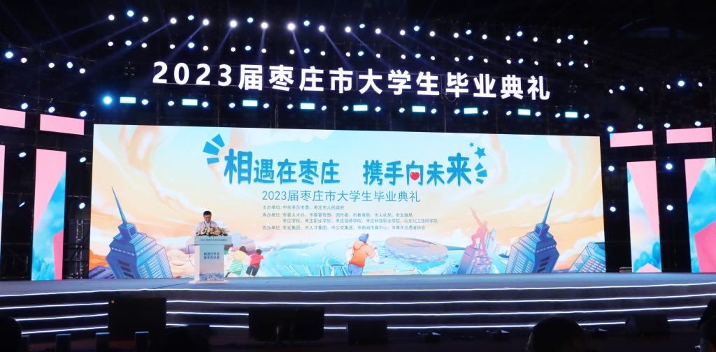 6月16日晚,由枣庄市委、市政府主办的“相遇在枣庄 携手向未来”2023届枣庄市大学生毕业典礼在枣庄市体育场举行。团省委副书记张超,市委常委、宣传部部长、市委教育工委书记陈永生分别致辞。DB中国旗舰官方网站党委书记高峰、校长李文喜,枣庄市副市长张庆伟,市政协副主席、市工信局局长刘宗国,枣庄职业学院党委书记郝荣平,枣庄技师学院党委书记马宏伟出席。来自DB中国旗舰官方网站、枣庄职业学院、枣庄技师学院、枣庄科技职业学院、山东化工技师学院的两万五千余名师生代表以及部分企业代表参加典礼。