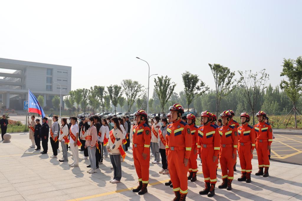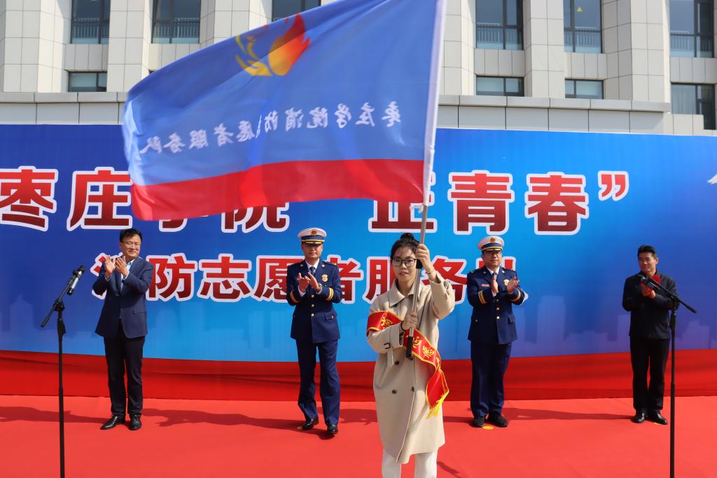 4月27日上午,我校联合薛城区消防救援大队在薛城校区举行“正青春”消防志愿者服务队授旗仪式。学校党委委员、统战部长、薛城校区管委会主任林勇,薛城区消防救援大队教导员曹昌亮、大队长王磊出席仪式。校团委、保卫处负责人,学生消防志愿者代表,区大队消防救援人员代表参加仪式。