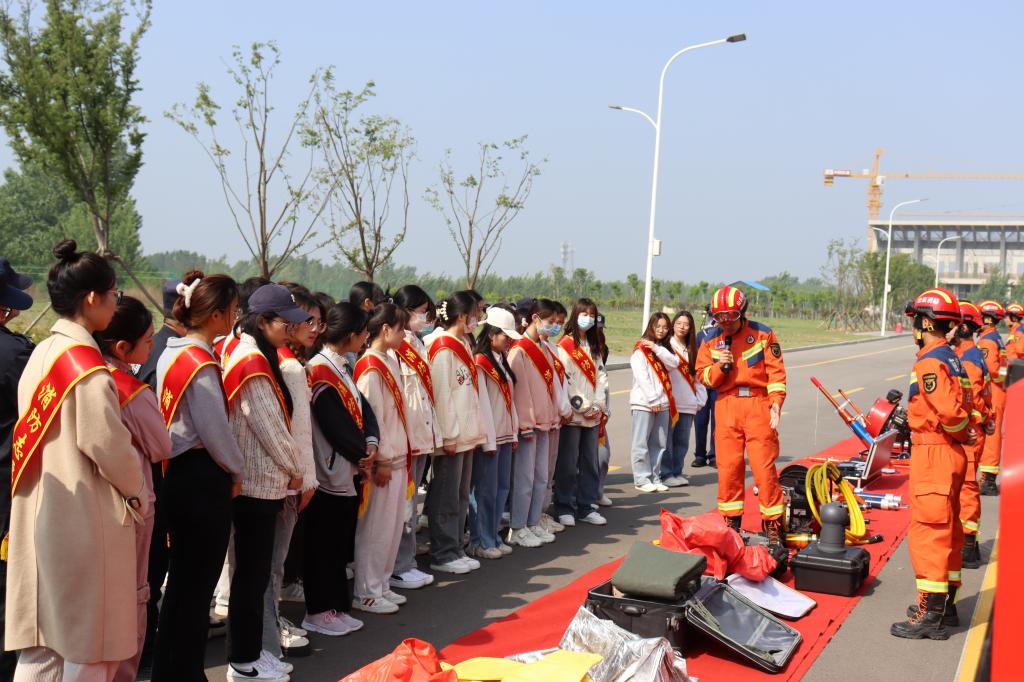 仪式结束后,区消防救援大队人员为我校消防志愿者现场讲解了各类消防器械的使用场景及使用方法,并现场进行演示。