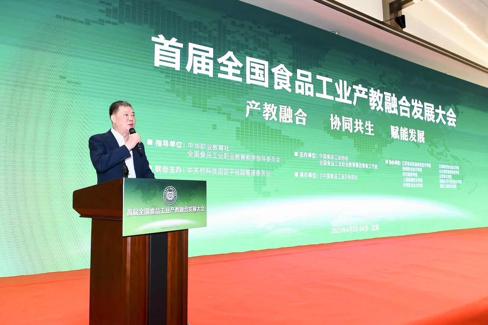 4月23日,以“产教融合、协同共生、赋能发展”为主题的首届全国食品工业产教融合发展大会在北京平谷区隆重召开,中国食品产教融合共同体正式成立。十二届全国政协副主席马培华、中华职业教育社党组书记、总干事方乃纯、中国食品工业协会常务副会长沈箎、农业农村部领导、总畜牧师张天佐、国家食物与营养咨询委员会主任陈萌山、国家卫生健康委食品安全标准与监测评估司司长刘金峰等出席大会并致辞。江南大学、中国农业大学、中国食品发酵工业研究院等涉食品高校科研院所代表,正大农牧食品(中国区)、伊利集团等食品骨干企业负责人共300余人参加大会。我校食品科学与制药工程学院派代表参加会议。