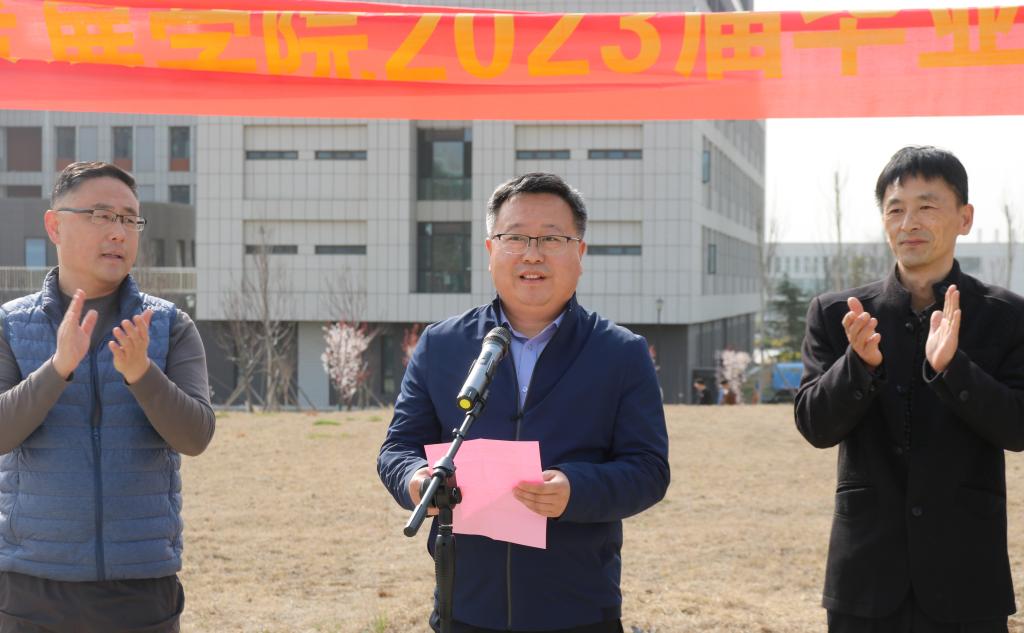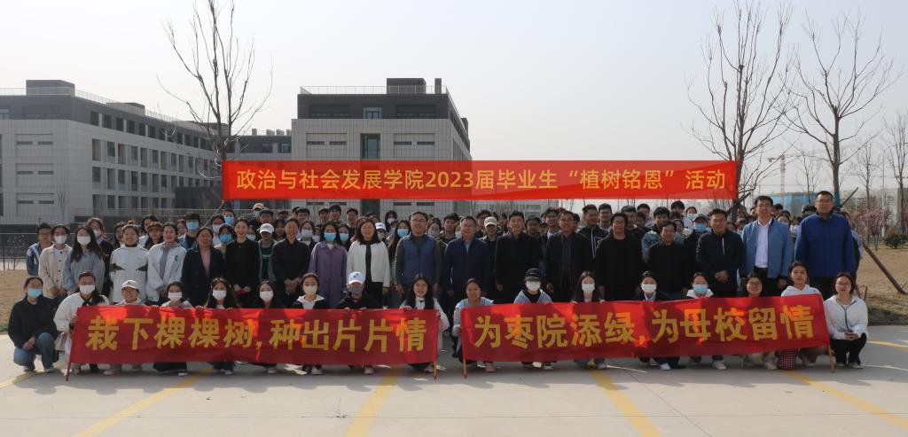 春和景明,万物勃发。3月15日下午,政治与社会发展学院在薛城校区举行2023届毕业生“植树铭恩”活动。校党委委员、副校长丰雷出席活动并致辞,校团委、学生工作处、后勤服务处、校园建设与管理处、保卫处等部门同志,政治与社会发展学院党政领导、全体教职员工、2023届毕业生和部分在校生代表参加活动。