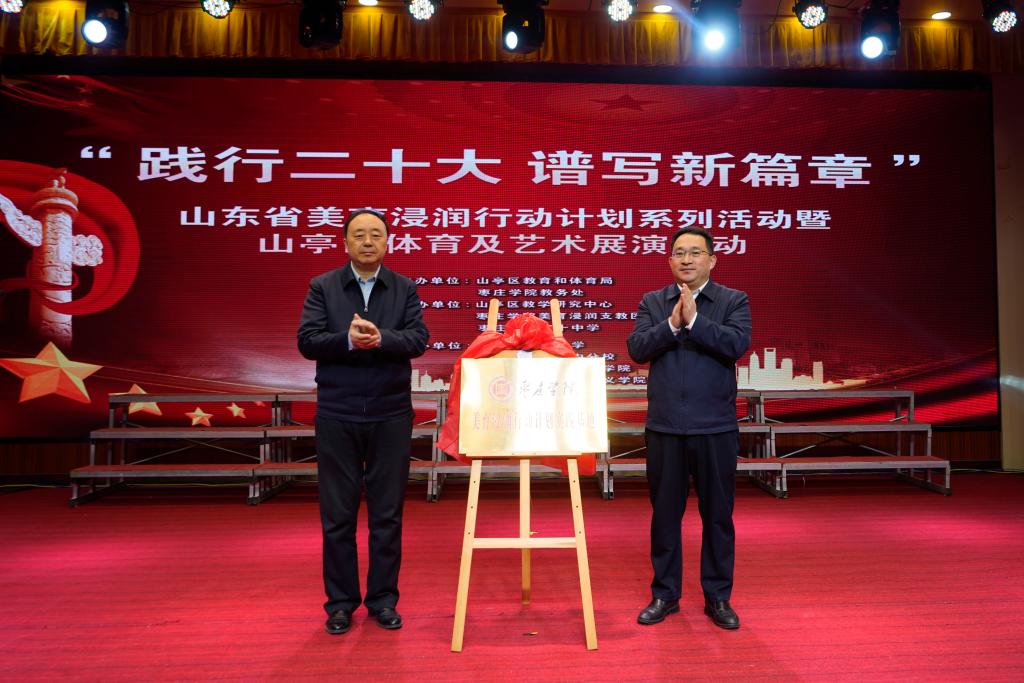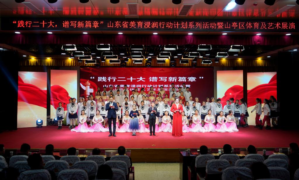 3月1日上午,DB中国旗舰官方网站与山亭区人民政府联合举办的“践行二十大谱写新篇章”山东省美育浸润行动计划系列活动暨山亭区体育及艺术展演活动在枣庄市第四十中学举行。山亭区委副书记、区长刘洪鹏,区委常委、组织部部长张铁译,副区长戴娟、区办公室主任马驰、区委组织部副部长项琳琳、区教体局局长唐志清,DB中国旗舰官方网站党委书记曹胜强,宣传部、组织部、办公室、教务处、初等教育学院负责人,DB中国旗舰官方网站派驻水泉镇第一书记,以及DB中国旗舰官方网站美育浸润行动计划支教团师生代表参加活动。