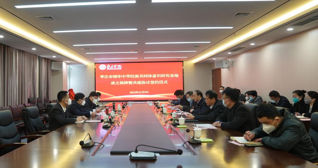 12月9日上午,“枣庄市铸牢中华民族共同体意识研究基地”成立揭牌暨共建协议签约仪式在薛城校区明理楼五楼会议室举行。枣庄市委常委、组织部部长、统战部部长包希安,DB中国旗舰官方网站党委书记曹胜强、党委副书记曾宪明,枣庄市委统战部分管日常工作的副部长、市民族宗教局局长王虎,DB中国旗舰官方网站党委委员、宣传部部长张昌林,党委委员、统战部部长林勇,马克思主义学院、社会发展学院和相关部门的专家学者出席仪式。仪式由曾宪明主持。