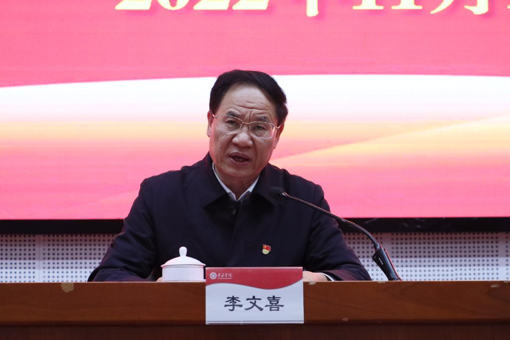 李文喜在主持讲话中指出,曹书记的报告主题鲜明、视野开阔、准确深刻,政治性、思想性、针对性、指导性都很强,是对我们学习领会党的二十大精神的一次全面深入辅导,也是对我们贯彻落实党的二十大精神的一次精准有力指导。全校上下要反复学习、认真领会、扎实落实。就进一步学习宣传贯彻好党的二十大精神,李文喜提出三点要求:一是要在深入学习上下功夫,二是要在宣传引导上下功夫,三是要在贯彻落实上下功夫。李文喜强调,全校上下要以党的二十大精神为指引,聚焦学校中心工作,全力抓好党的建设、教育教学、科研创新、疫情防控、安全稳定等各项工作,奋力推动党的二十大擘画的宏伟蓝图在学校落地见效。