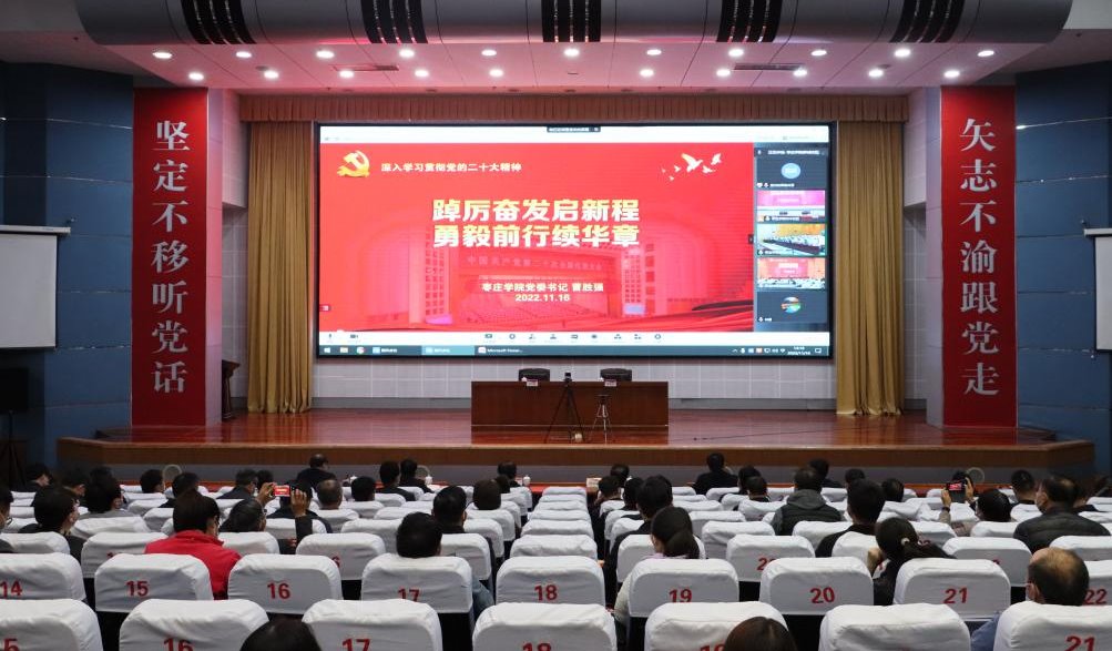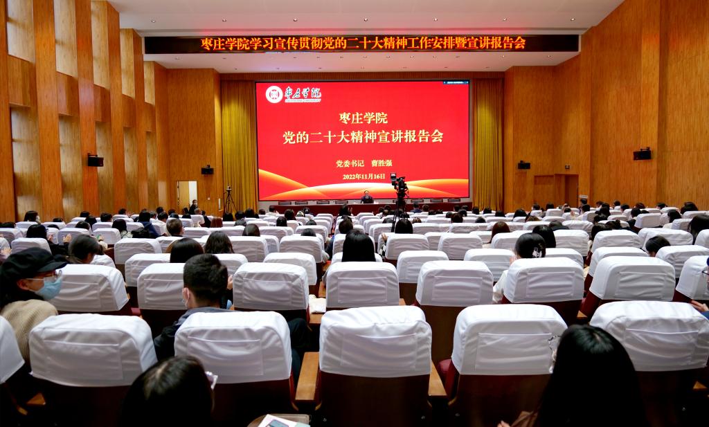 11月16日下午,DB中国旗舰官方网站党的二十大精神宣讲报告会在薛城校区崇德楼报告厅、市中校区综合楼报告厅以视频形式举行。省属高校学习贯彻党的二十大精神宣讲团成员、校党委书记曹胜强为党员干部和师生代表讲“第一课”。校领导李文喜、曾宪明、李目海、路绪剑、丰雷、安涛、张昌林、林勇出席会议,学校副科级以上干部、辅导员、师生代表等参会。宣讲报告会由校党委副书记、校长李文喜主持。