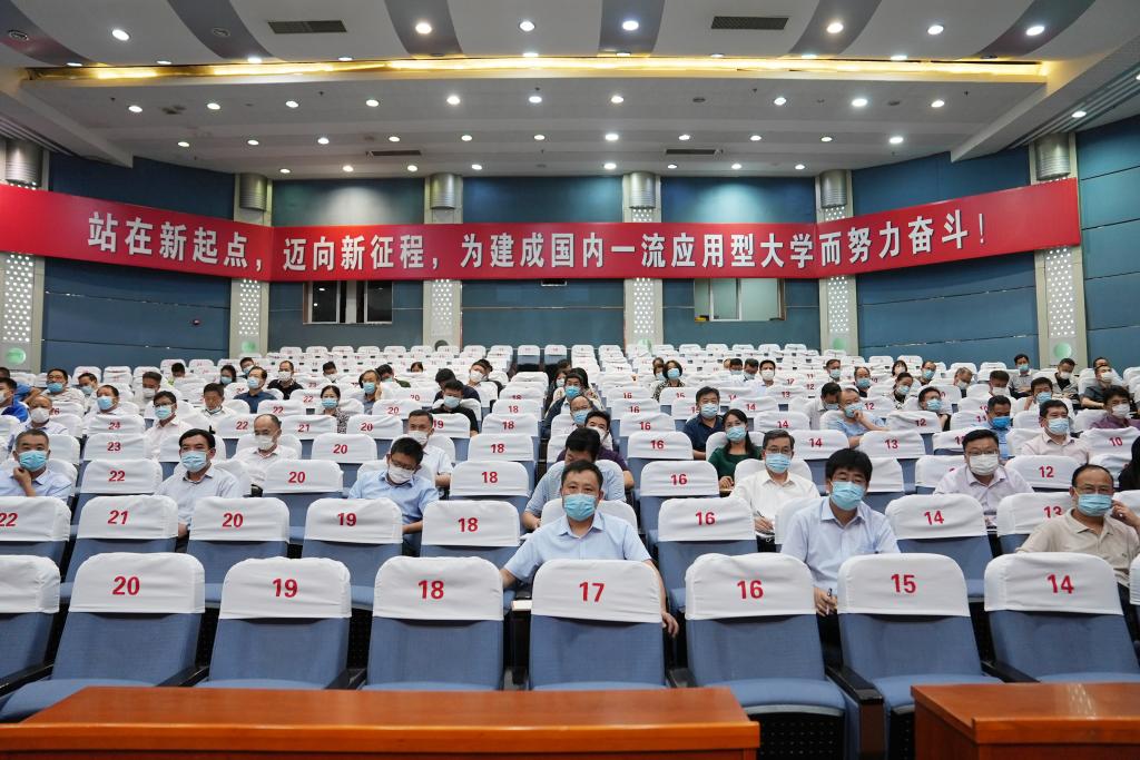 随后,曹胜强从外部环境和学校自身两个方面阐述了学校改革发展面临的新形势与挑战,并结合翔实数据和具体案例,全面分析了下半年学校工作思路与重点。他强调,今年下半年是学校改革发展的关键时期,申报硕士点和建设一流应用型大学目标能否顺利实现,就看这半年的工作成效。全校上下要切实增强“走在前、开新局”的政治自觉、思想自觉和行动自觉,以党的建设为引领、以内涵提升为核心、以硕士点建设为抓手,聚心聚力、精准施策、靶向发力,确保全年目标任务的圆满完成。一要聚心党建引领,持续压实高质量发展政治保证。要加强党的全面领导;要扎实做好迎接宣传贯彻党的二十大工作;要推进全面从严治党向纵深发展。二要聚力内涵提升,强力推进一流应用型大学建设。要持续深化产教融合不断增强向应用型转型的引领度;要紧密对接地方产业切实增强对经济社会发展的贡献度;要扎实推进质量提升持续增强内涵式发展的达成度;要统筹抓好疫情防控切实筑牢安全发展的保障度。三要聚焦重点攻坚,全力冲刺获批硕士学位授予权。要推进学科建设攻坚、推进人才引进攻坚、推进科研经费攻坚、推进办学经费攻坚。