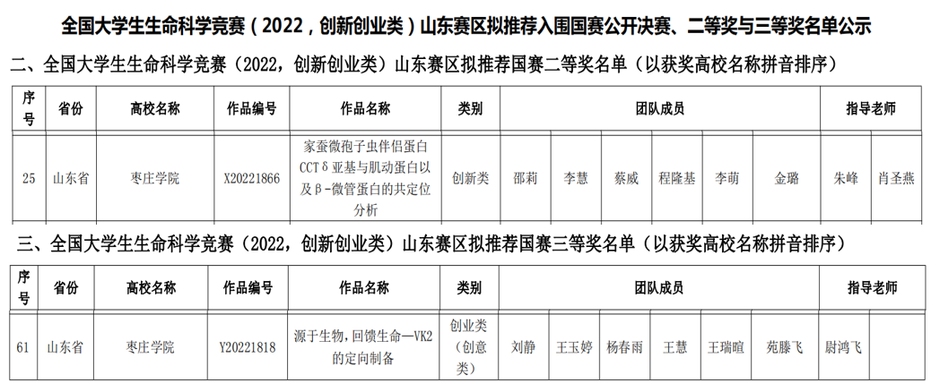 近日,全国大学生生命科学竞赛(2022,创新创业类)决赛落下帷幕。根据疫情防控实际,大赛采取分区举行、选手线上答辩、专家线下评审的方式。本届大赛共计收到参赛作品5053项,资格审查通过并进入网评4401项;经初赛网评和复赛网评,入围公开决赛项目555项。经过激烈角逐,我校生命科学学院共斩获国家级二等奖1项、国家级三等奖1项。