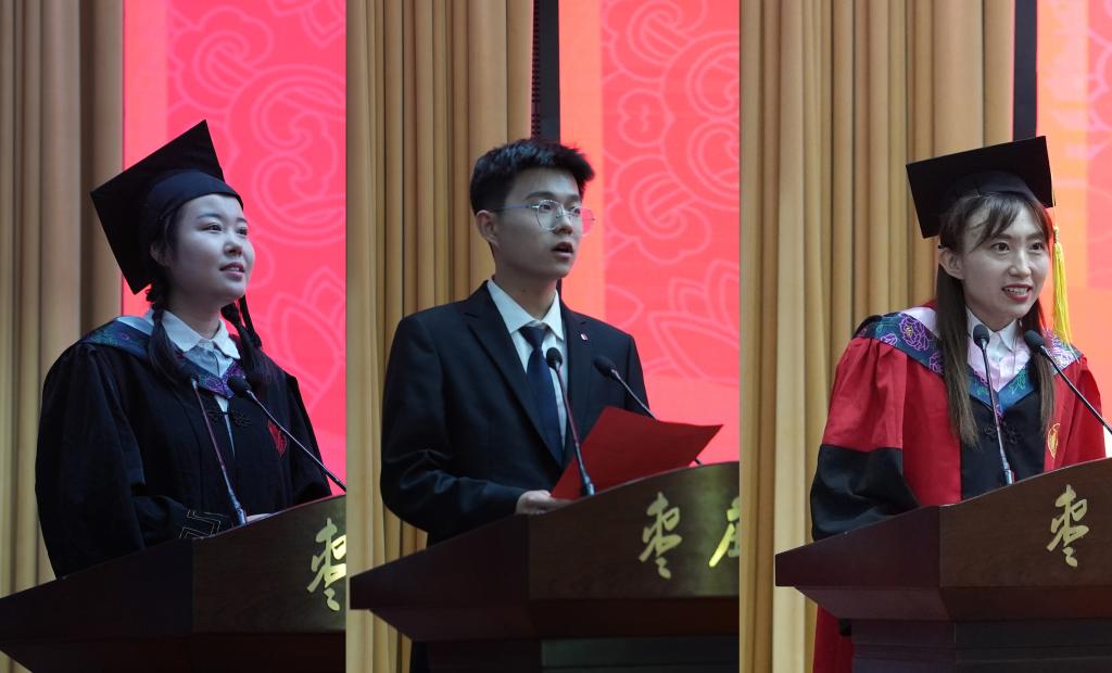 化学化工与材料科学学院2018级毕业生魏一诺作为优秀毕业生代表发言,回顾了在枣院学习生活的点点滴滴,并代表全体毕业生郑重承诺:将始终践行“兼爱尚贤、博物戴行”之校训,立大志、明大德、成大才、担大任。数学与统计学院2019级学生宋鹏伟作为在校生代表发言,表示将以学长为榜样,坚定前进信心,不负青春韶华,书写新的华彩篇章。人工智能学院团总支书记李利苹作为教师代表发言,为全体毕业生送上了最真挚的祝福,并勉励他们要始终拥有精神生活、始终坚持独立思考。