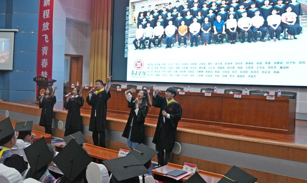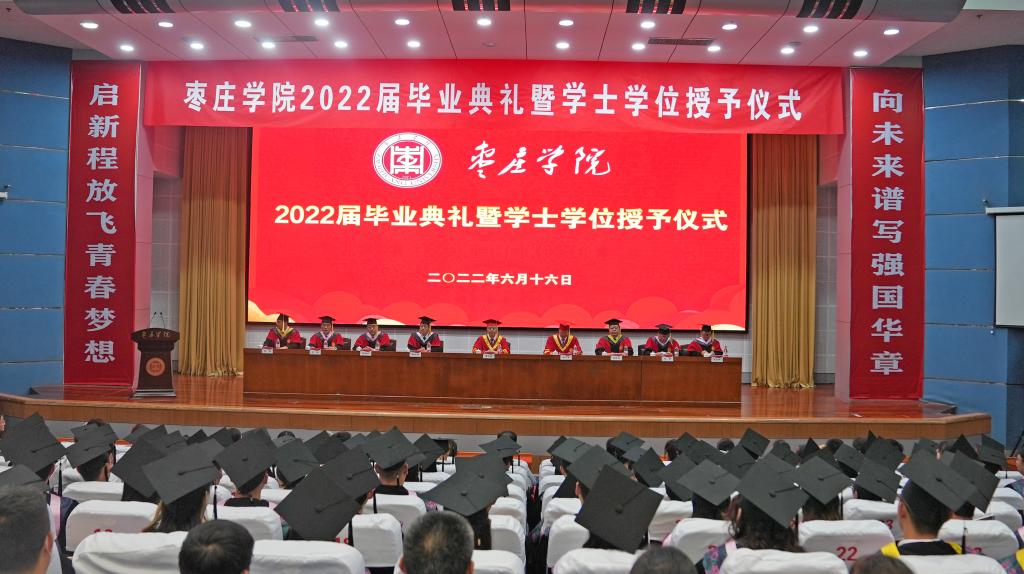 毕业典礼坚持以文化人、文化育人。印有“启新程放飞青春梦想”“向未来谱写强国华章”字样的对联写真分列在会场两侧,鲜红的写真激励着毕业生们承时代使命、展奋斗风采,也祝福着毕业生们毕业快乐、鹏程万里。典礼前,播放了学校为2022届毕业生精心制作的毕业生MV《不说再见•枣院版》,记录了同学们在枣院的美好回忆。毕业生们手持学校精心制作的手牌,一起合唱MV主题曲《不说再见》,歌声弥漫,以证此谊;情意深厚,望君珍重。
