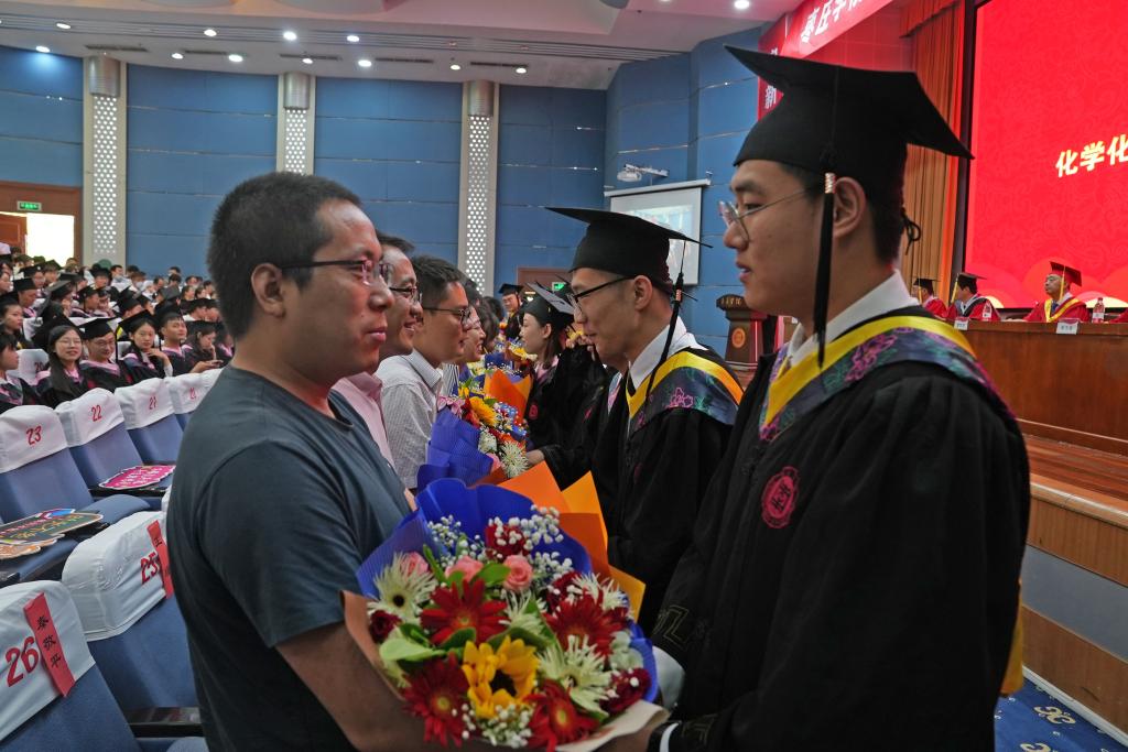 典礼上,21名毕业生代表向教师代表敬献鲜花,深切表达了对母校的深深眷恋、对师长的无限感激以及对校园生活的依依不舍。典礼在浓情厚意、充满感动的氛围中顺利落下帷幕。典礼结束后,校领导和毕业生代表在综合楼前合影留念。