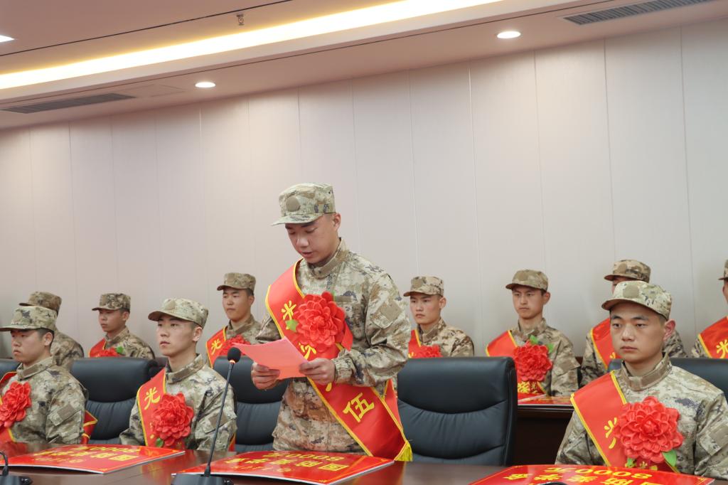 光电工程学院应用电子技术专业阮杨代表新兵发言,对学校和老师的精心培养表示衷心感谢,并代表全体应征入伍学生郑重承诺,入伍后一定保持昂扬斗志,遵规守纪,听从指挥,刻苦训练,争做“四有”优秀士兵,不辜负母校期望。