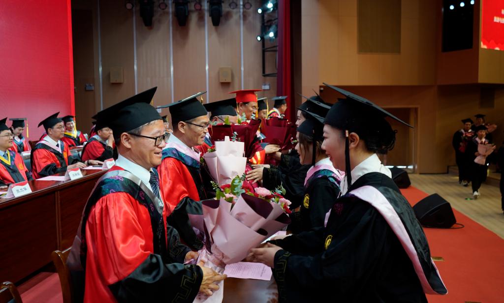 桃李芬芳,教泽绵长。典礼上,毕业生代表为老师们献上了一束束饱含深情和敬意的鲜花,对老师们的悉心教导和辛勤付出表示衷心感谢。典礼结束后,校领导和毕业生代表合影留念。