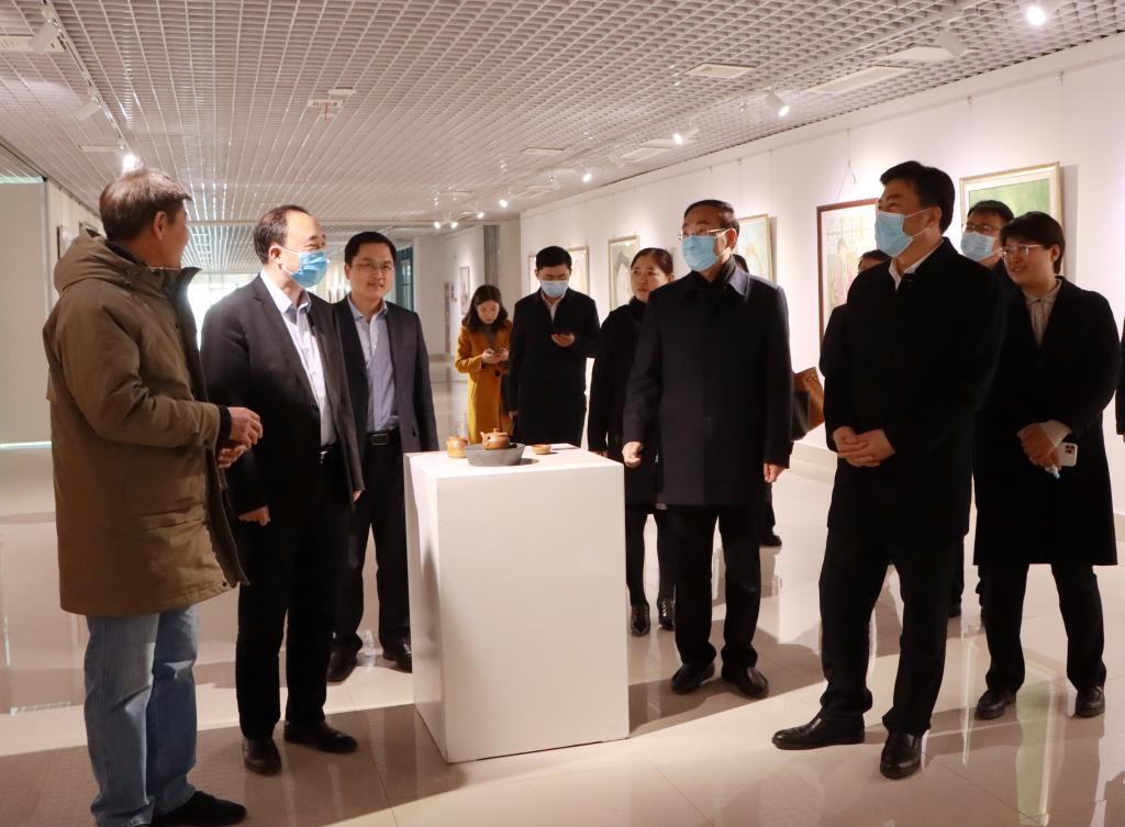 随后,刘天东一行来到博雅楼参观了我校美术与艺术设计学院青年学生美术作品展、学生社团民间手工艺协会作品展,认真听取了相关介绍,并建议学院下一步可以积极面向社会举办作品展,以地方元素为创作题材,更好服务地方发展,为枣庄“工业强市 产业兴市”贡献学院力量。