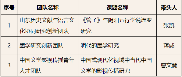 近日,山东省社会科学联合会公示了第四批山东省哲学社会科学青年人才团队,我校三个团队成功入选,立项数量居全省同类高校首位。这是我校自入选首批省哲学社会科学青年人才团队后在人文社科类省级人才团队立项中的又一重大突破。