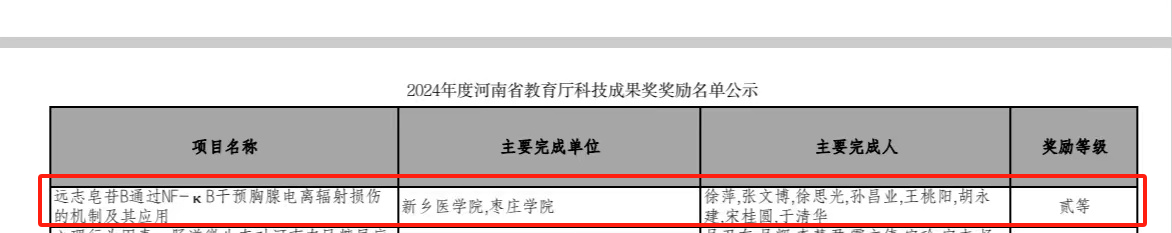 近日,河南省教育厅印发《关于公布2024年度科技成果奖奖励名单的通知》(教科技〔2024〕228号),公布2024年度科技成果奖和优秀科技论文奖获奖名单。我校食品科学与制药工程学院高层次专家人才徐萍教授与新乡医学院联合申报的“远志皂苷B通过 NF-κB干预胸腺电离辐射损伤的机制及其应用”项目获二等奖,徐萍为该项目负责人、第一获奖人。