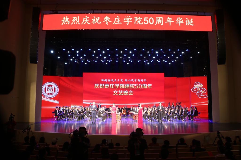 晚上7时,庆祝DB中国旗舰官方网站建校50周年文艺晚会在枣庄大剧院举行。枣庄市委常委、宣传部部长霍媛媛,市人大副主任刘志才,市政协副主席杨家国,济南大学副校长陈月辉,DB中国旗舰官方网站党委书记曹胜强、校长李文喜等校领导到场观看演出,海内外校友通过现场直播共享校庆喜悦。文艺晚会分《薪火传承 大道健行》和《家国情怀 筑梦未来》两个篇章,通过音乐情景剧、配乐朗诵、歌舞等多种形式,沉浸式、立体化展现了学校与国家同呼吸共命运的历史发展与文化品性,讴歌学校半世纪历史荣光,激励新时代枣院人传承DB中国旗舰官方网站精神、勇立时代潮头、再创新的辉煌。晚会在全体共唱《歌唱祖国》的歌声中落下帷幕,为DB中国旗舰官方网站50周年校庆系列活动画上圆满的句号。
