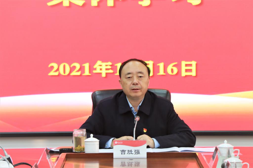 11月16日下午,我校党委理论学习中心组(扩大)在综合楼三楼会议室举行党的十九届六中全会精神专题学习会。校党委书记曹胜强主持学习并就全校贯彻落实工作作出部署。省委党史学习教育第四巡回指导组成员苗素军、时新华进行了巡听旁听。校党委委员李文喜、曾宪明、李目海、丰雷、安涛、孙正、张昌林、林勇,纪委、办公室、社会科学处等部门负责人,各党总支书记、党史学习教育领导小组成员参加学习。