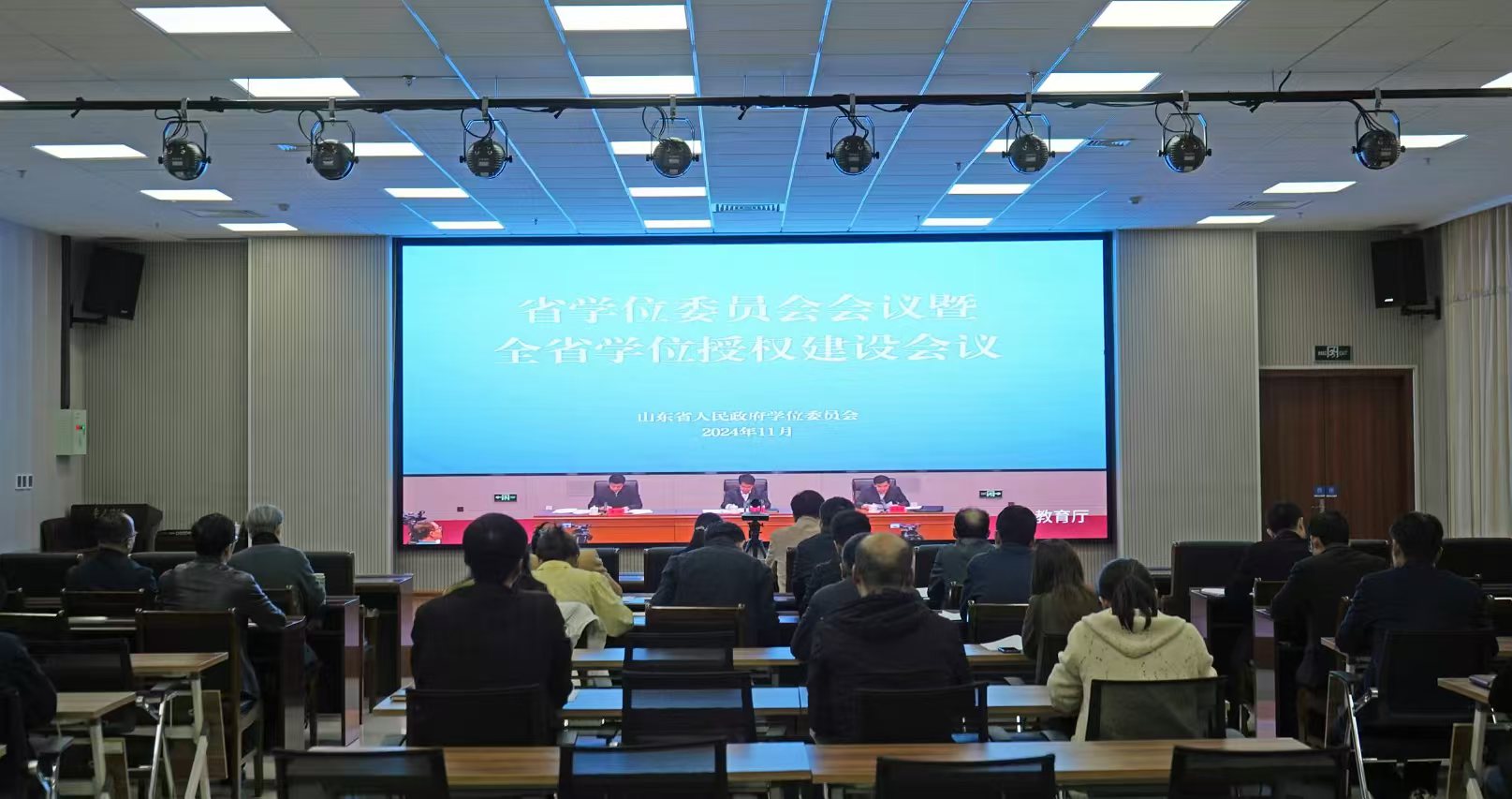 11月14日下午,省人民政府学位委员会办公室召开省学位委员会会议暨全省学位授权建设会议。省学位委员会主任、副省长邓云锋出席会议并讲话。省学位委员会副主任,省委教育工委常务副书记,省教育厅党组书记、厅长李明出席会议,省政府副秘书长刘斯杰主持会议。学校党委副书记、校长李文喜应邀在省教育厅一楼指挥中心主会场参加会议并作交流发言。学校在薛城校区明理楼113会议室设立视频分会场,校党委委员、副校长李目海,相关职能部门、学院及学位点负责人参加会议。
