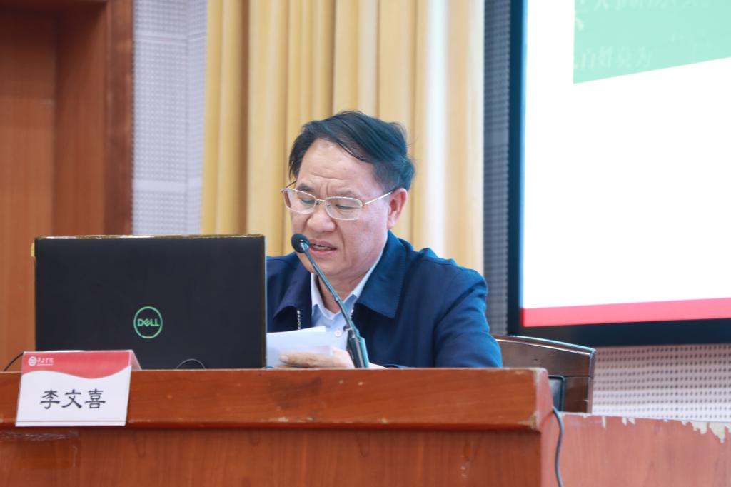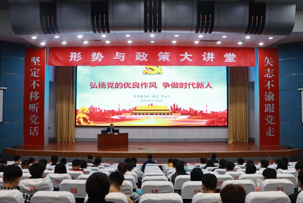 11月3日下午,我校在综合楼学术报告厅举行形势与政策大讲堂报告会,校党委副书记、校长李文喜以《弘扬党的优良作风,争做时代新人》为题作宣讲报告。省委党史学习教育第四巡回指导组成员时新华主任、吕建设主任,校党委委员、宣传部部长张昌林出席报告会。马克思主义学院部分教师,旅游与资源环境学院和信息科学与工程学院300多名学生到场聆听报告。
