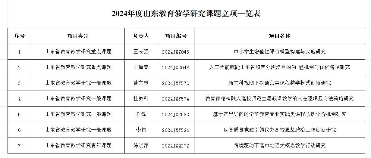 近日,山东省教育科学研究院公布2024年度山东省教育教学研究课题立项名单,我校申报的7项课题全部成功获批,其中2项为重点课题,5项为一般课题(含青年一般课题1项),立项率达100%。