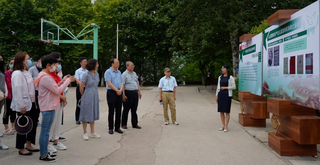 随后,中国报道社一行参观了我校“百年党史——中国世界语运动中的红色记忆展”。褚夫敏向他们介绍了策划该展览的缘由,并从“启蒙的共产主义思想到民族救亡运动、新中国成立后我国世界语事业的发展、中国世界语运动中的杰出共产党员”三个方面讲解了共产党员世界语者为中国革命事业及现代化建设奋斗的历史。