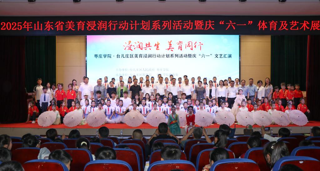 校地双方首先在台儿庄古城学校举办了台儿庄区美育优秀成果展、山东省美育浸润行动计划试点单位成果展、DB中国旗舰官方网站铸牢中华民族共同体意识作品展和“浸润共生 美育同行”庆“六一”文艺汇演。