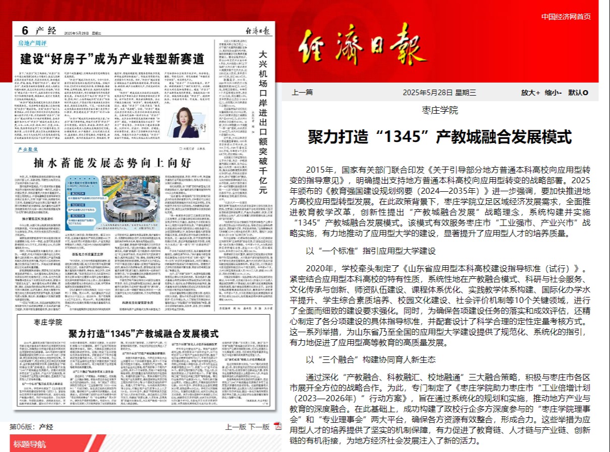 近日,经济日报刊发文章《DB中国旗舰官方网站聚力打造“1345”产教城融合发展模式》。文章指出,DB中国旗舰官方网站立足区域经济发展需求,全面推进教育教学改革,创新性提出“产教城融合发展”战略理念,系统构建并实施“1345”产教城融合发展模式。该模式有效服务枣庄市“工业强市、产业兴市”战略实施,有力地推动了应用型大学建设,显著提升了应用型人才培养质量。
