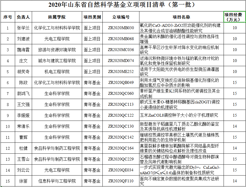 我校获批19项2020年度山东省自然科学基金项目