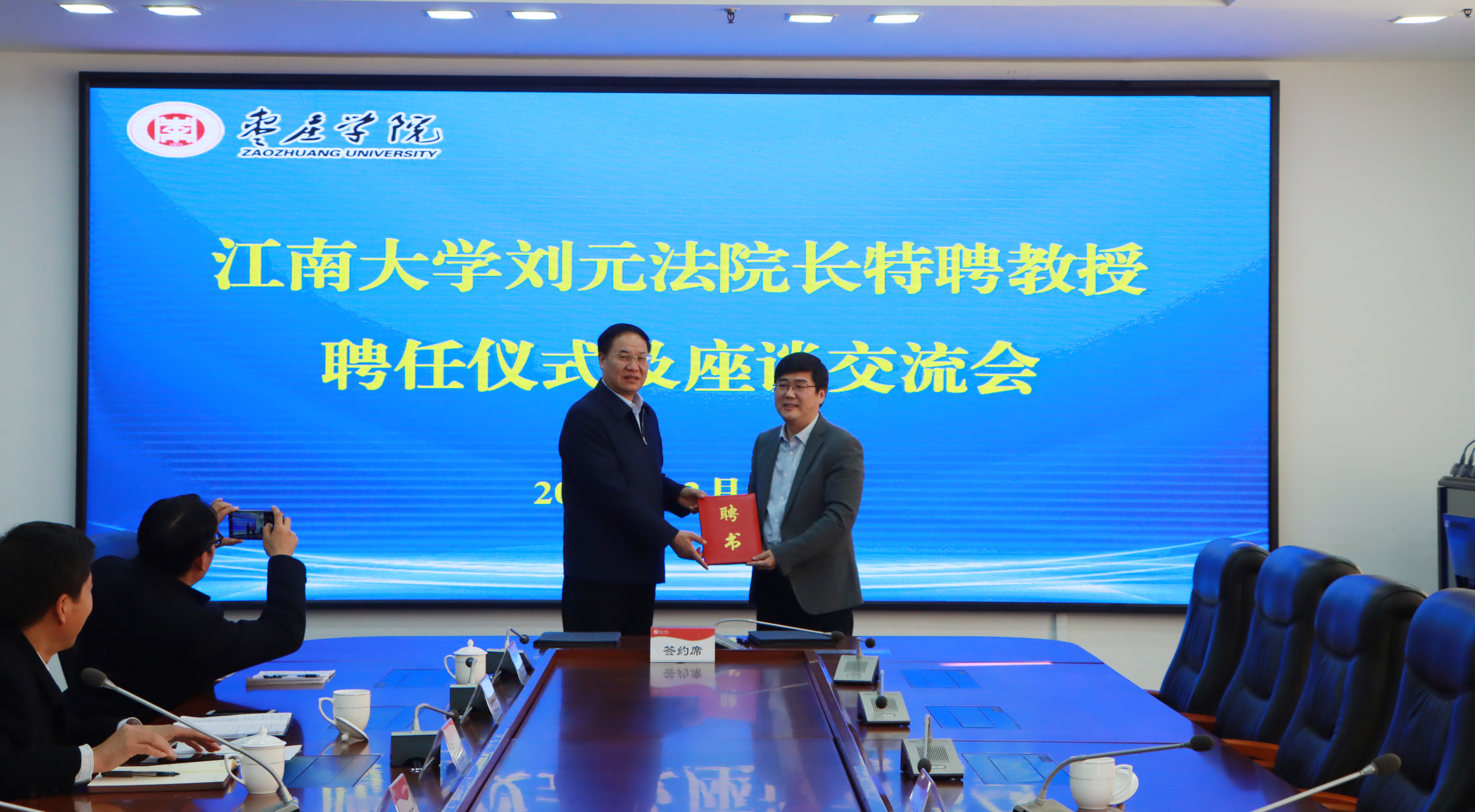 李文喜为刘元法颁发特聘教授聘书。