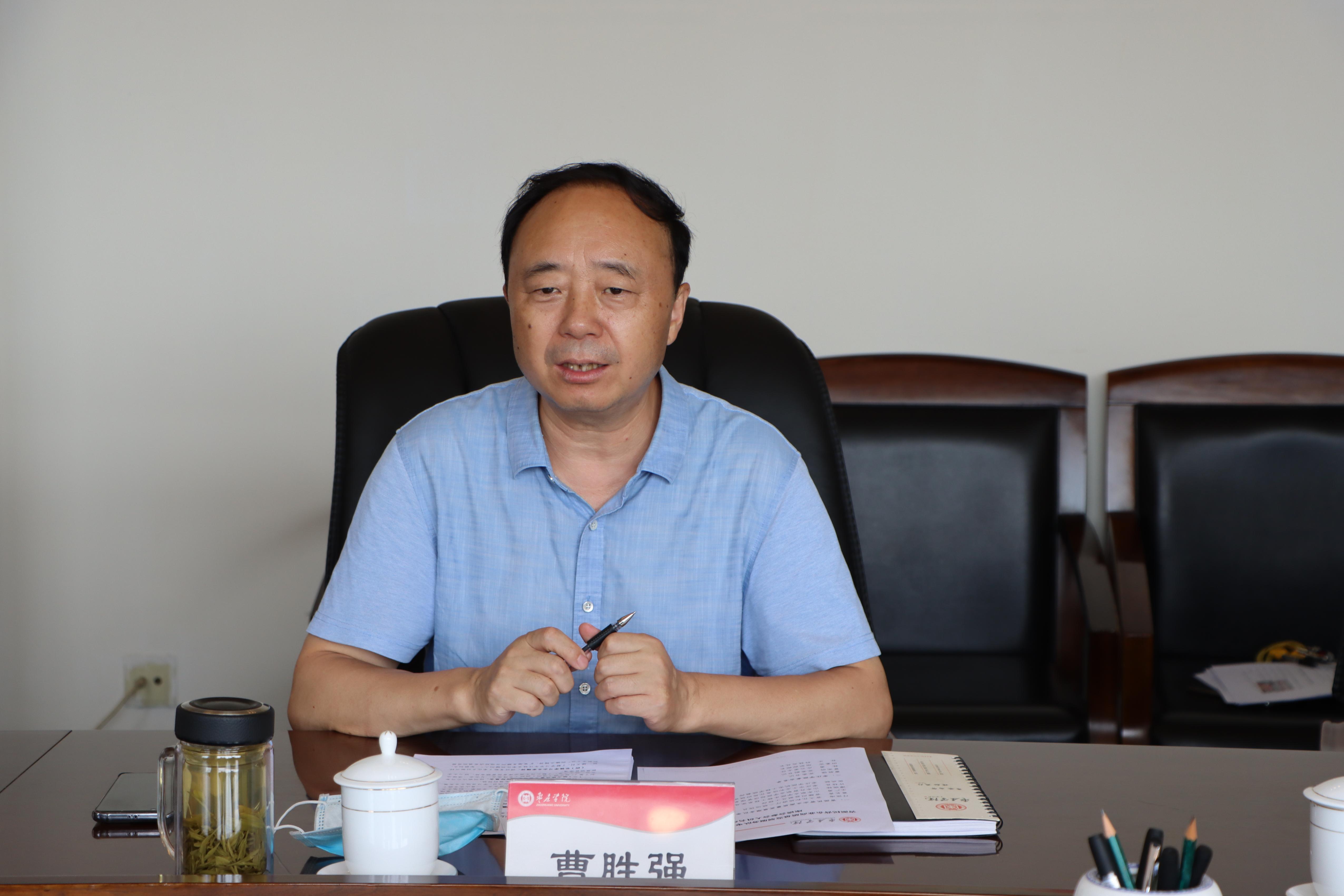 7月8日下午,省派民营企业高质量发展服务队枣庄一队(以下简称枣庄一队)成员付俊海等一行6人来校交流,校党委书记曹胜强、副书记曾宪明在校综合楼八楼会议室与枣庄一队举行座谈,办公室、组织部、科技处等部门负责人参加座谈。