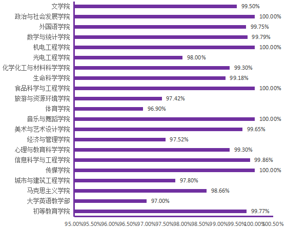 各院(部)的开课数、开课门次、班级数、教师数(人次)、学生数(人次)和学生上课率情况如下图所示: