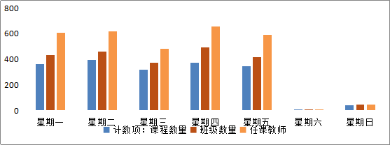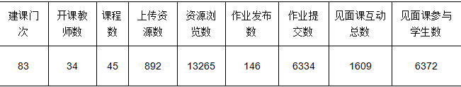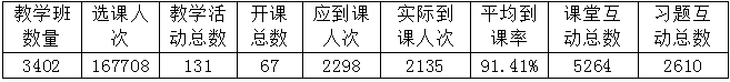 我校师生在雨课堂平台使用情况,根据大数据统计,由此查看本周教学班数量、教学活动总、开课总数、应到课人次、实际到课人次、课堂互动总数、平均到课率、习题互动总数,详情见下表: