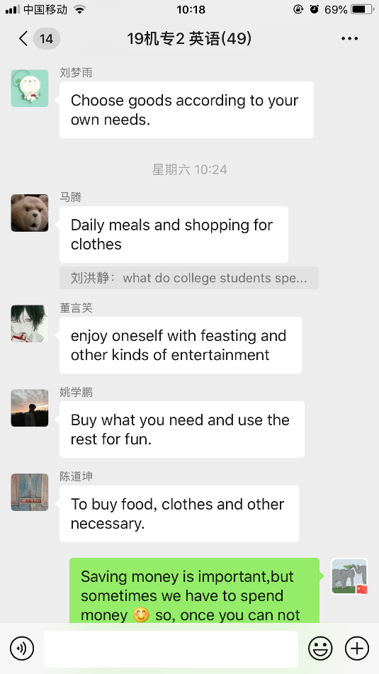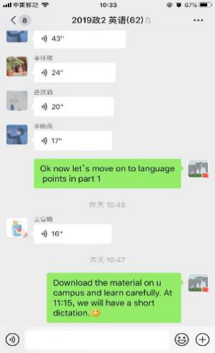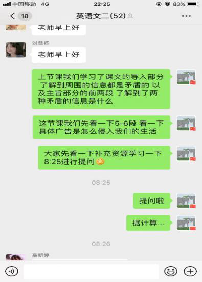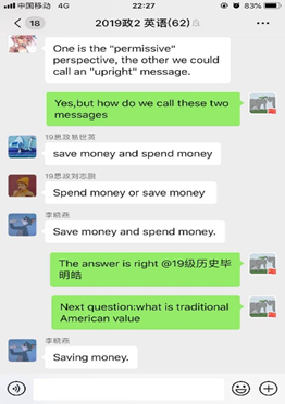 在上课过程中,利用微信群课堂对课文相关观点提出问题,让学生思考并回答。大学英语并不是仅仅教授知识点和语法知识,我们关注更多的是学生听说读写译等各方面的全面发展,以及正确价值观的传导和自我观点的表达。所以课堂上鼓励学生勇于表达自己,通过自我观点的表达提升学生的英语表达能力和应用能力。