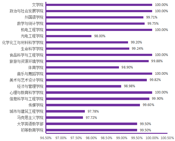 各院(部)的开课数、开课门次、班级数、教师数(人次)、学生数(人次)和学生上课率情况如下图所示: