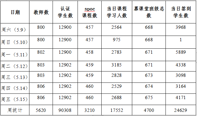 本周运行课程累计3210门次,上线教师数5620人次,认证学生数90308人次,当日课程学习累计17552人次,慕课堂班级总数4700。