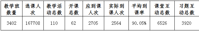 我校师生在雨课堂平台使用情况,根据大数据统计,由此查看本周教学班数量、教学活动总、开课总数、应到课人次、实际到课人次、课堂互动总数、平均到课率、习题互动总数,详情见下表: