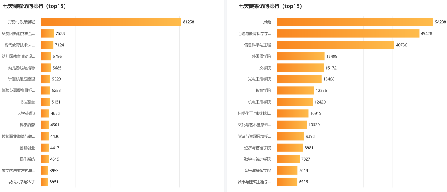 根据超星平台提供的大数据分析,可以查看本周课程打开次数、课程访问排行、较为频繁的活动类型、活跃度最高的院系和学习端口占比分别为: