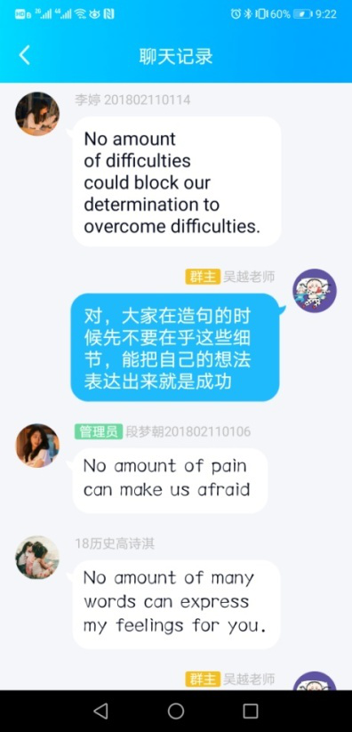 首先,在QQ群课堂上播放提前录制好的词汇和课文讲解,鼓励学生进行课堂互动。每段视频结束后,给学生布置不同的学习任务并进行在线互动,最大程度提高学生的参与度。
