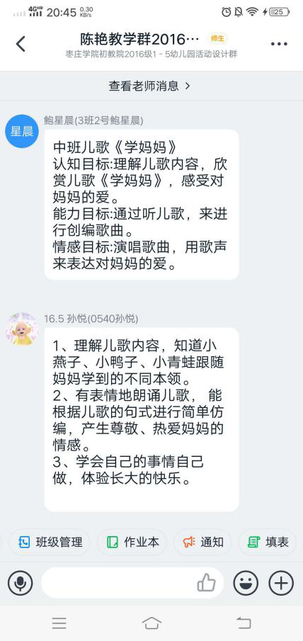 为了保证线上教学效果,提高教学效率,课堂上讲授的重点和难点,课后通过作业检验学习效果。陈老师通过多次实践选择小程序班级小管家,非常适合课程写-说-讲的要求,有利于学生学、练、用结合。教师发布不同形式的作业,学生可以拍照、录音、视频的方式上传,并能随时跟踪学生的作业完成情况。同时在微信班级群互动平台,及时发布课程相关信息,增进课程互动。教师全程在线答疑解惑,拓展课下教学空间,进一步巩固教学效果。