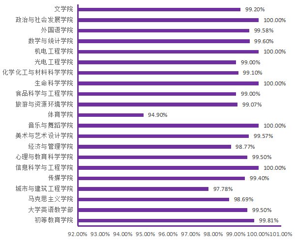 各院(部)的开课数、开课门次、班级数、教师数(人次)、学生数(人次)和学生上课率情况如下图所示:
