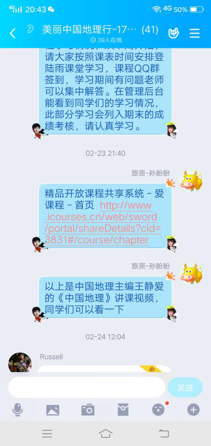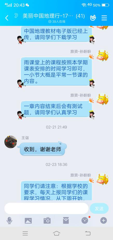 自线上教学开展以来,任课教师依托中国大学慕课、雨课堂、智慧树网等多个在线教学平台,并结合QQ群、微信群、钉钉等即时通讯工具组织网上教学,教学手段灵活,教学效果良好。本期将分享旅游与资源环境学院孙盼盼老师依托“雨课堂+课程QQ群+爱课程”开展在线教学的典型做法。